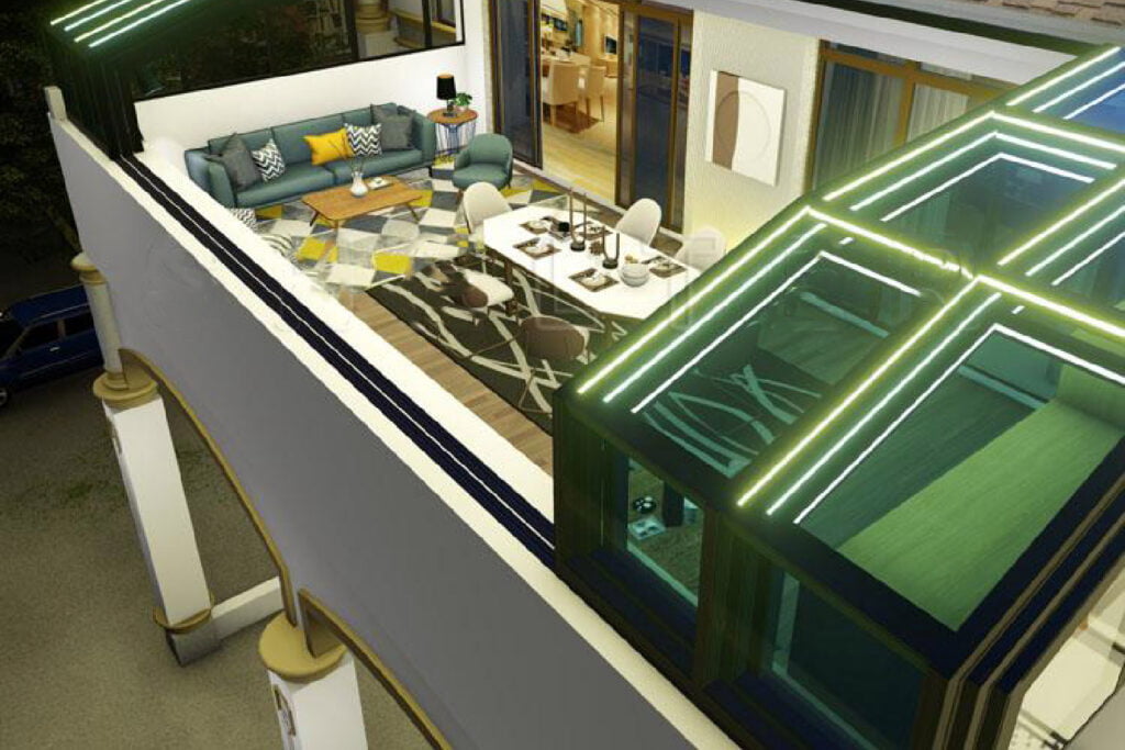 A telescopic roof, also called as Electric skylight window is a type of retractable roof that is put up on the ceiling of your home. It can be made automatic as well as manual. This is the new generation Smart Skylight Roof System will allow you to enjoy the view of a clear sky and also get ventilation on a humid day. The roofing allows natural light to enter your space and avoids heat traps. Now you can choose to either enjoy the sky under the roof or open the roof to enjoy the sky. The roof is made up of glass / polycarbonate with a metallic structure, It is strong enough to withstand any kind of harsh climate. The roof enhances the experience of the climate, as under the clear roof it gives a completely different perspective of nature.